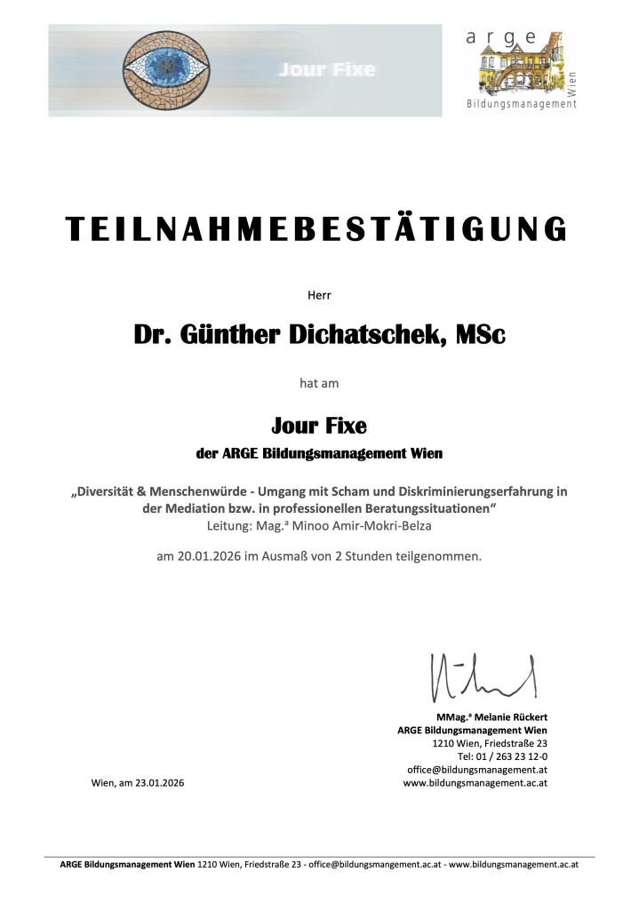 Absolvent des Instituts für Erziehungswissenschaft/ Universität Innsbruck/ Doktorat (1985); des 10. Universitätslehrganges Politische Bildung/ Universität Salzburg - Klagenfurt/ Master (2008); des 6. Universitätslehrganges Interkulturelle Kompetenz/ Universität Salzburg/ Diplom (2012); der Weiterbildungsakademie Österreich/ Wien/ Diplome (2010), der Personalentwicklung für Mitarbeiter an den Universitäten Wien/ Bildungsmanagement/ Zertifizierungen (2010) und Salzburg/ 4. Interner Lehrgang für Hochschuldidaktik/ Zertifizierung (2016), des Online - Kurses "Digitale Werkzeuge für Erwachsenenbildner_innen"/ TU Graz - CONEDU - Werde Digital.at -Bundesministerium für Bildung/ Zertifizierung (2017), des Fernstudiums Erwachsenenbildung/ Evangelische Arbeitsstelle Fernstudium - Comenius Institut Münster/ Zertifizierung (2018), des Fernstudiums Nachhaltigkeit/ Evangelische Arbeitsstelle Fernstudium - Comenius Institut Münster/ Zertifizierung (2020)