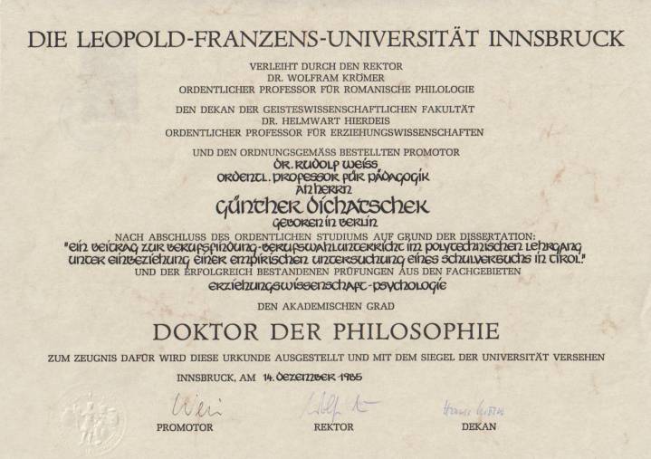APS - Lehramt (VS - HS - PL 1970, 1975, 1976), zertifizierter Schülerberater (1975) und Schulentwicklungsberater (1999), Mitglied der Lehramtsprüfungskommission für die APS beim Landesschulrat für Tirol (1993-2002)