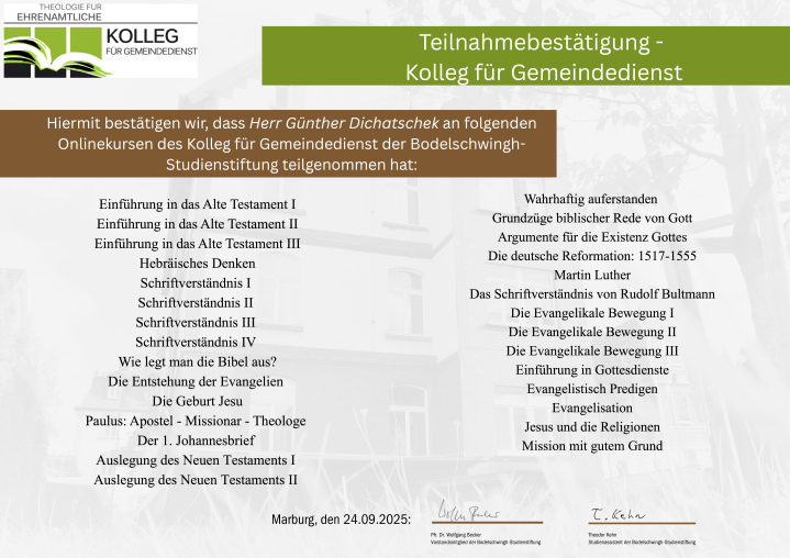 Absolvent Höhere Bundeslehranstalt für alpenländische Landwirtschaft Ursprung - Klessheim/ Reifeprüfung, Maturantenlehrgang der Lehrerbildungsanstalt Innsbruck/ Reifeprüfung - Studium Erziehungswissenschaft/ Universität Innsbruck/ Doktorat (1985), 1. Lehrgang Ökumene - Kardinal König Akademie/ Wien/ Zertifizierung (2006); 10. Universitätslehrgang Politische Bildung/ Universität Salzburg - Klagenfurt/ MSc (2008), Weiterbildungsakademie Österreich/ Wien/ Diplome (2010), 6. Universitätslehrgang Interkulturelle Kompetenz/ Universität Salzburg/ Diplom (2012), 4. Interner Lehrgang Hochschuldidaktik/ Universität Salzburg/ Zertifizierung (2016) - Fernstudium Grundkurs Erwachsenenbildung/ Evangelische Arbeitsstelle Fernstudium, Comenius - Institut Münster/ Zertifizierung (2018), Fernstudium Nachhaltige Entwicklung/ Evangelische Arbeitsstelle Fernstudium, Comenius - Institut Münster/ Zertifizierung (2020), Onlinekurs Grundkurs - Aufbaukurs/ Theologie für Ehrenamtliche - Kolleg für Gemeindedienst/ Bodelschwingh - Studienstiftung Marburg/ Zertifizierung (2025)