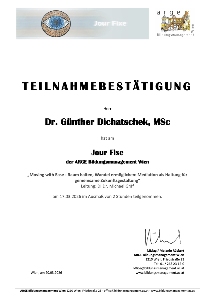 - Absolvierung des Internen Lehrganges Hochschuldidaktik/ Universität Salzburg (2016),